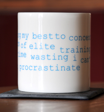 It says: ‘i am doing my best to concentrate but due to years of elite training in the dark art of time wasting i can’t resist the urge to procrastinate.’